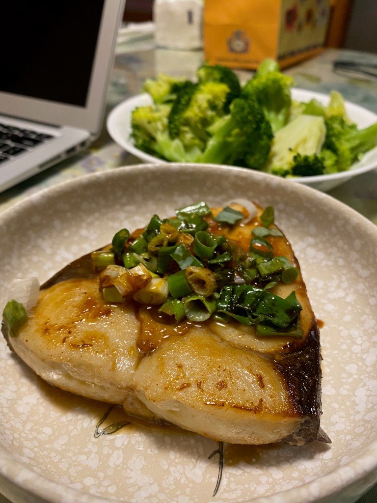 I really too many white fish steak in the freezer…… I decided to make my first meal alone Japanese. Japanese style pan-fried fish with boiled broccoli and miso soup with tofu.