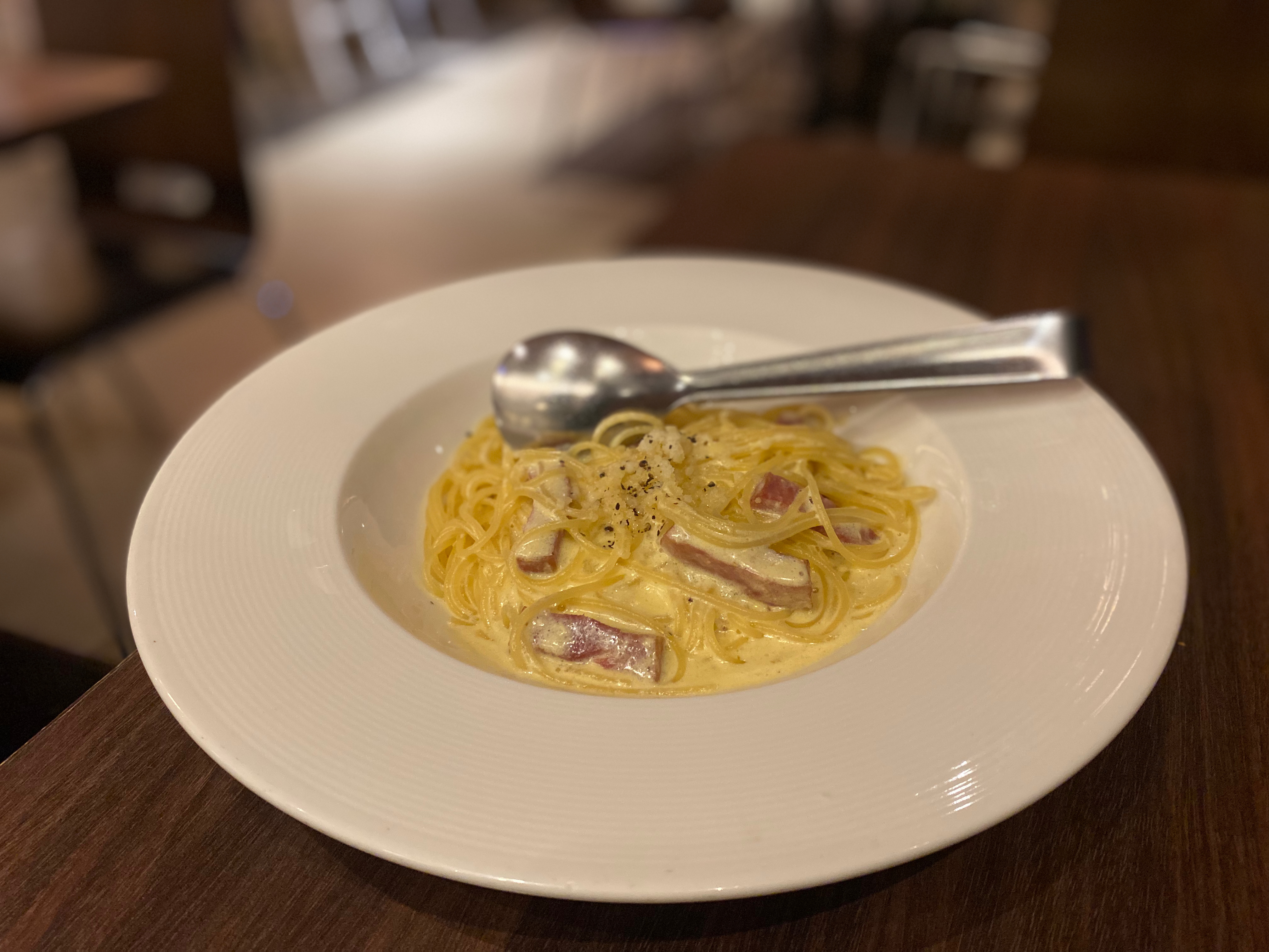 Sometimes I am craving for pasta, and I love Carbonara pasta because I always fail when making it. The egg yolk always turns into scrambled eggs haha. This pasta restaurant is Japanese style and it is pretty famous and has many branches in Taipei. The price is not cheap of course. I ordered a salad and my favorite pasta. The portion is okay but I would like them to use linguine or fettuccine instead of pasta though, because the wider noodles can soak up more sauce. The traditional Carbonara pasta doesn’t have cream, only egg yolk, parmesan cheese, pancetta, and white wine. I don’t mind they use bacon to replace pancetta since this ingredient is rare in Taiwan. But every time if I saw they add cream into Carbonara, I would not order it. I always remember what my chef said, THERE IS NO CREAM IN CARBONARA!!! Using cream is easy to make than using egg yolk, since it wouldn’t become scrambled eggs! That is why many restaurants add cream into it. Fortunately, Bellini pasta didn’t use cream, and it tastes so smooth. I like it~ This restaurant reaches the good quality level of chain pasta restaurants:)
